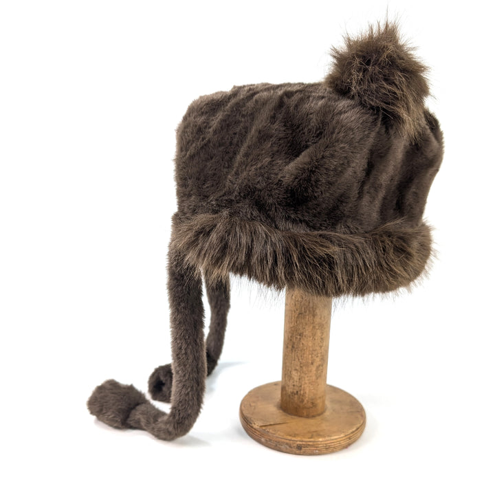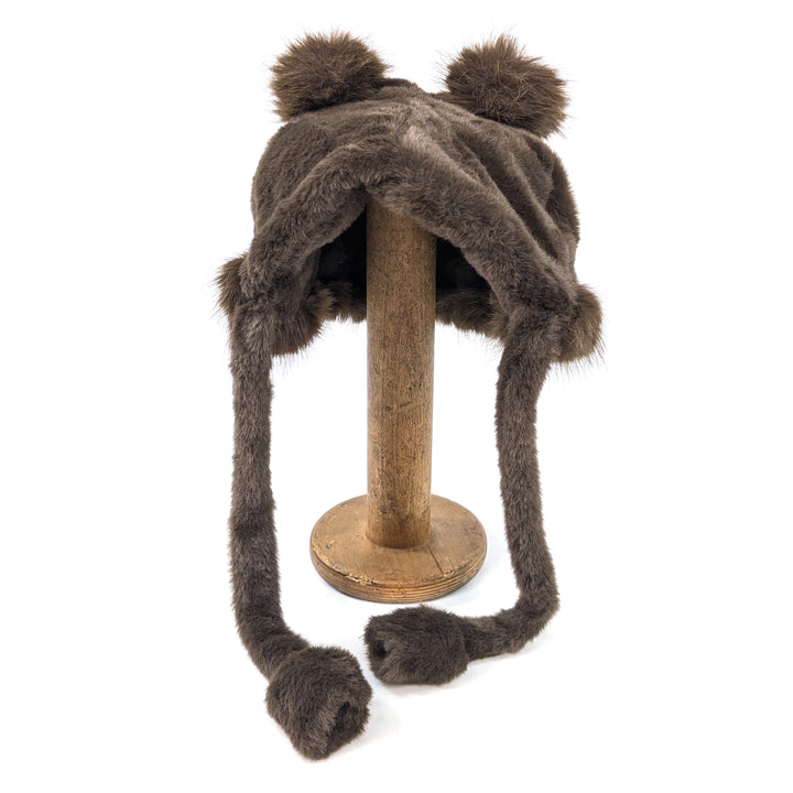 Faux Fur Brown Bear Hat with Long Ties - Dark Brown