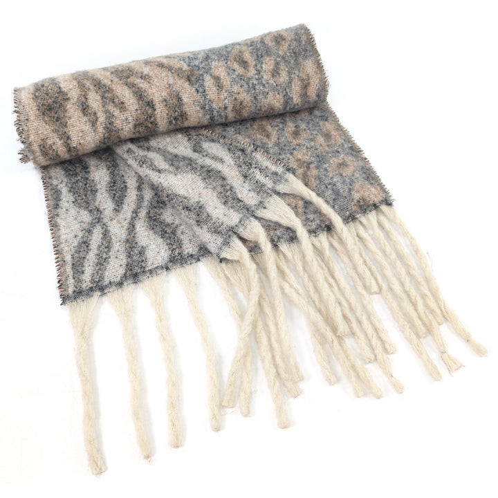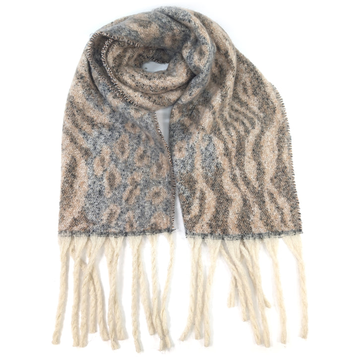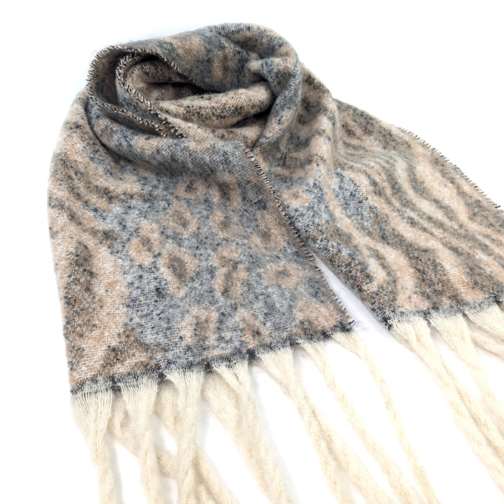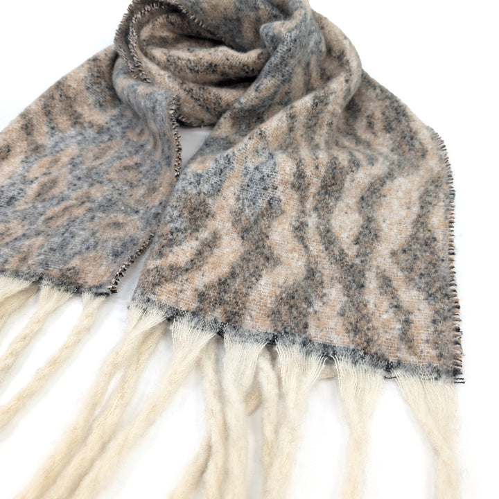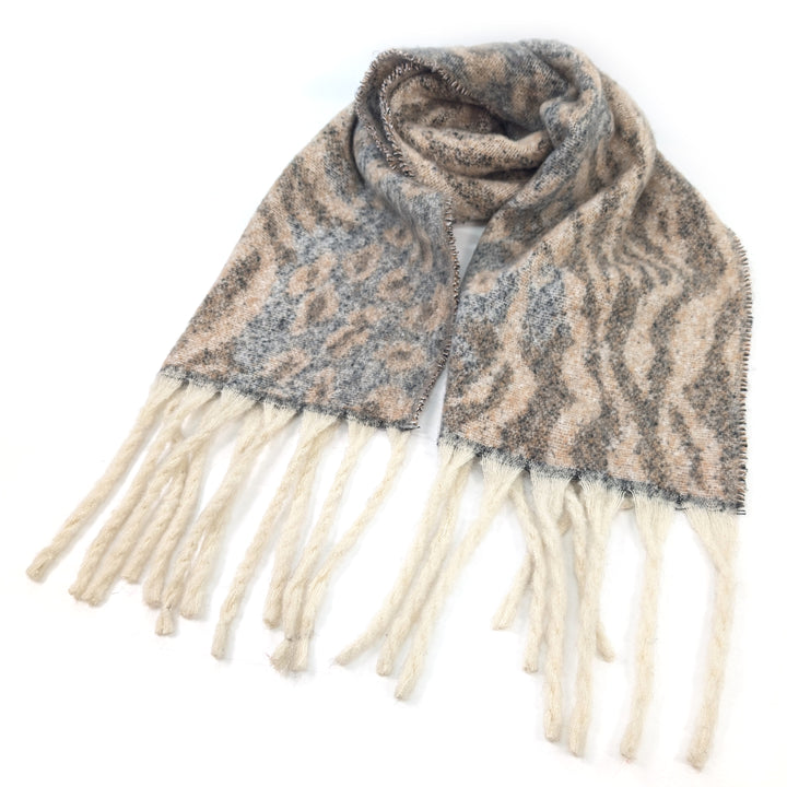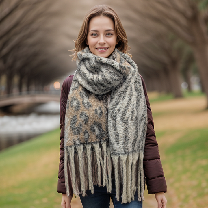 This latte-toned scarf adds easy elegance to your cold-weather outfits. Its thick texture and classic animal print make it a timeless choice for layering.