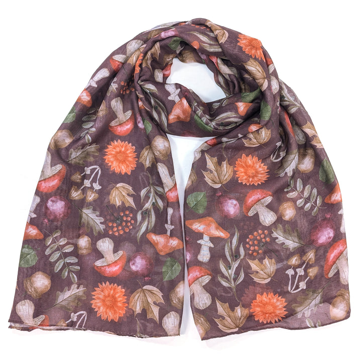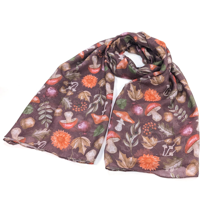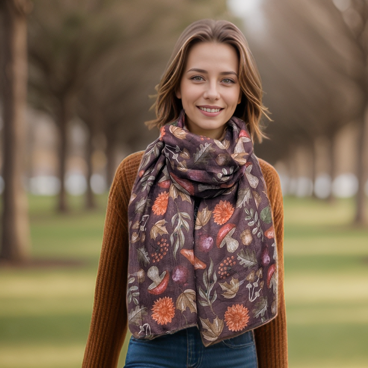 Celebrate the magic of the forest with this Aubergine Mushroom Scarf. Its rich purple base and autumnal illustrations bring warmth and whimsy to any look. Ideal for nature lovers and cosy season styling.