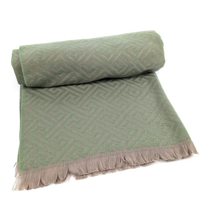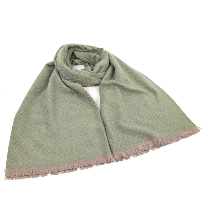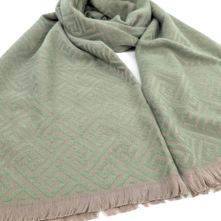 Update your winter wardrobe with this fresh take on the classic pashmina. The soft green shade combined with the intricate maze pattern makes this scarf a subtle statement pieceeasy to wear, endlessly stylish.