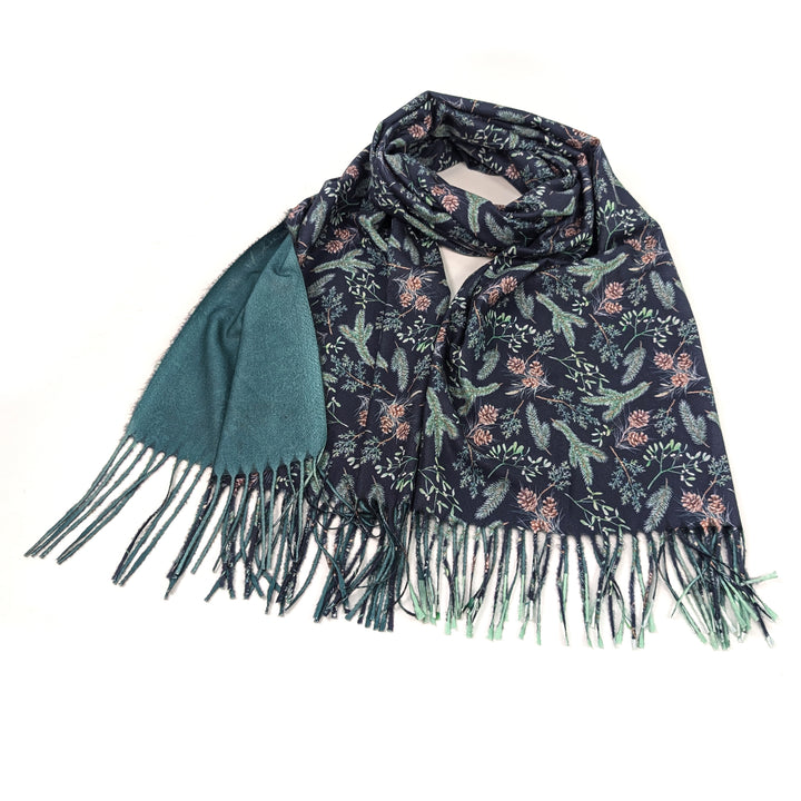 Wrap up in seasonal style with the Fir Cone Pashmina Style Scarf. Featuring a beautifully detailed fir cone and foliage print on a deep blue base, this scarf brings cosy woodland vibes to your winter wardrobe. The plain green reverse and matching tassels add a touch of sophistication while keeping you snug and stylish.