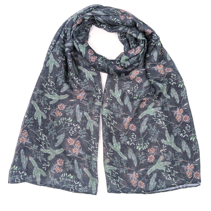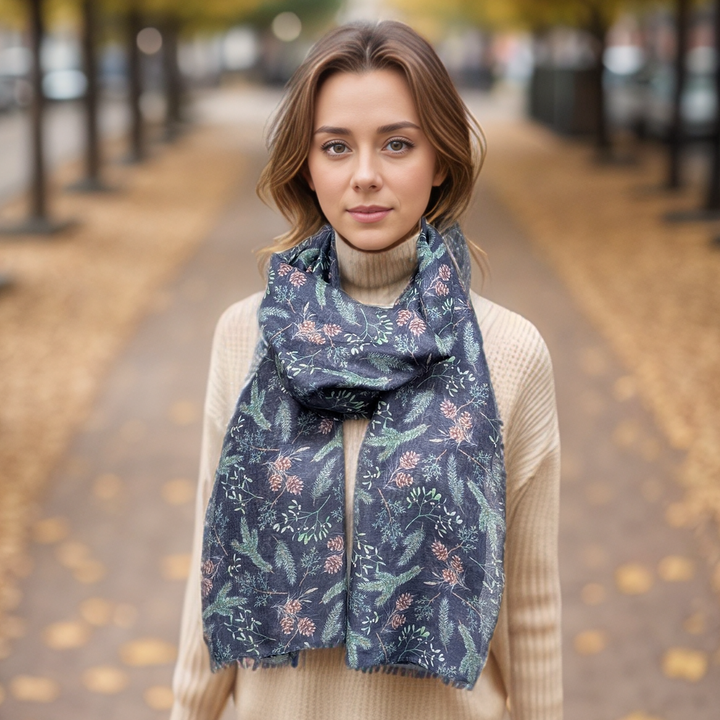 The Fir Cone Scarf captures the quiet beauty of the winter woods with its detailed fir cone and pine branch print. Set against a rich dark blue backdrop, this exclusive design is a timeless nod to woodland walks and seasonal style. Lightweight yet warming, its the perfect transitional piece from autumn through spring.