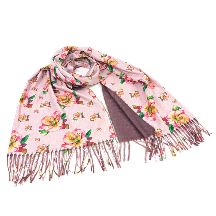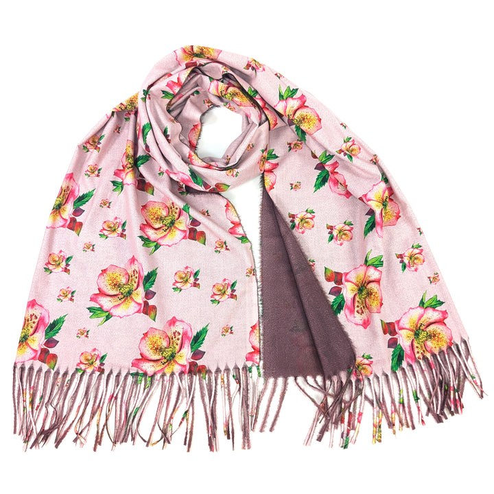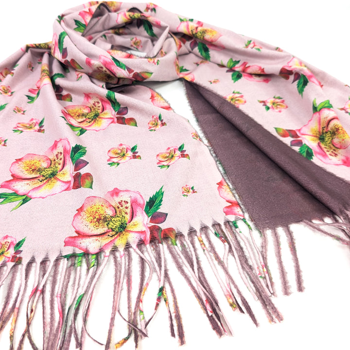 The Hellebore Pashmina Style Scarf Pink is a beautiful blend of floral romance and cosy comfort. The detailed hellebore design evokes a cottage garden feel, while the plum reverse and tassels add richness and warmth. A graceful choice for chilly days or thoughtful gifting.