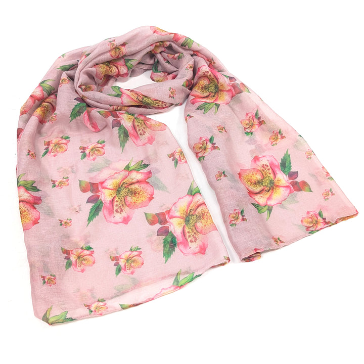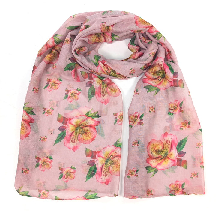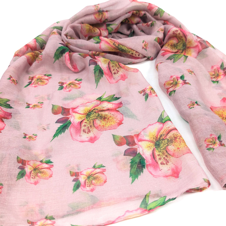 The Hellebore Scarf Pink brings the delicate beauty of this winter flower into wearable art. Set against a light pink background, the exclusive hellebore design is soft, romantic and versatile. A lovely finishing touch for casual looks or dressier days alike.