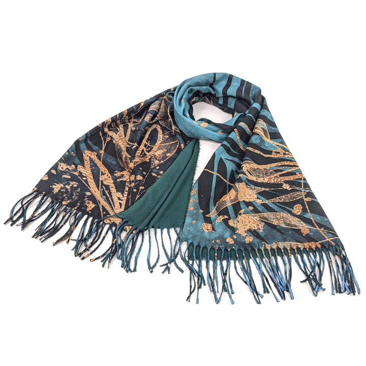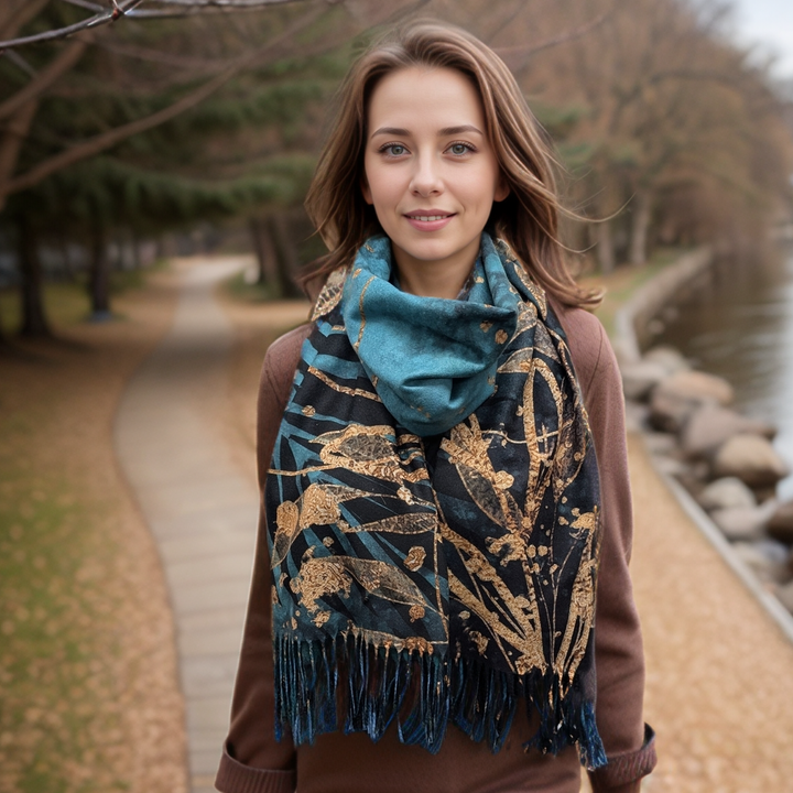 Teal and gold combine in this nature-inspired print to create a scarf that’s as stylish as it is practical. A unique choice for winter dressing.