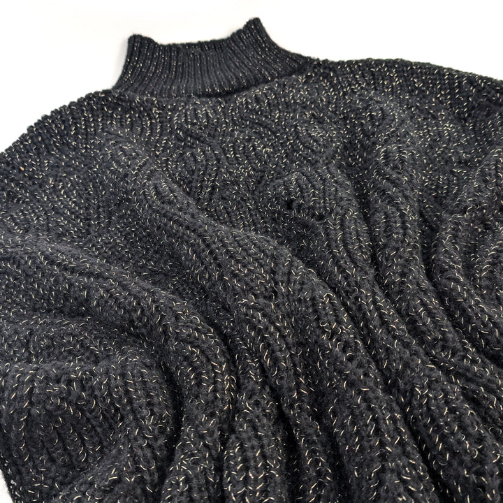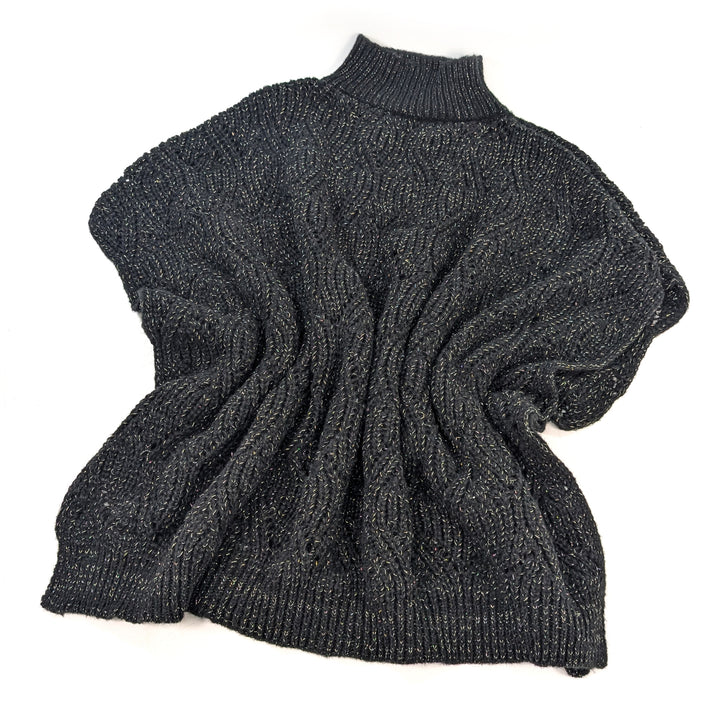 Understated shimmer meets cable-knit charm in this black high-neck poncho. Whether you're running errands or heading out to dinner, this piece has you coveredliterally and stylishly.