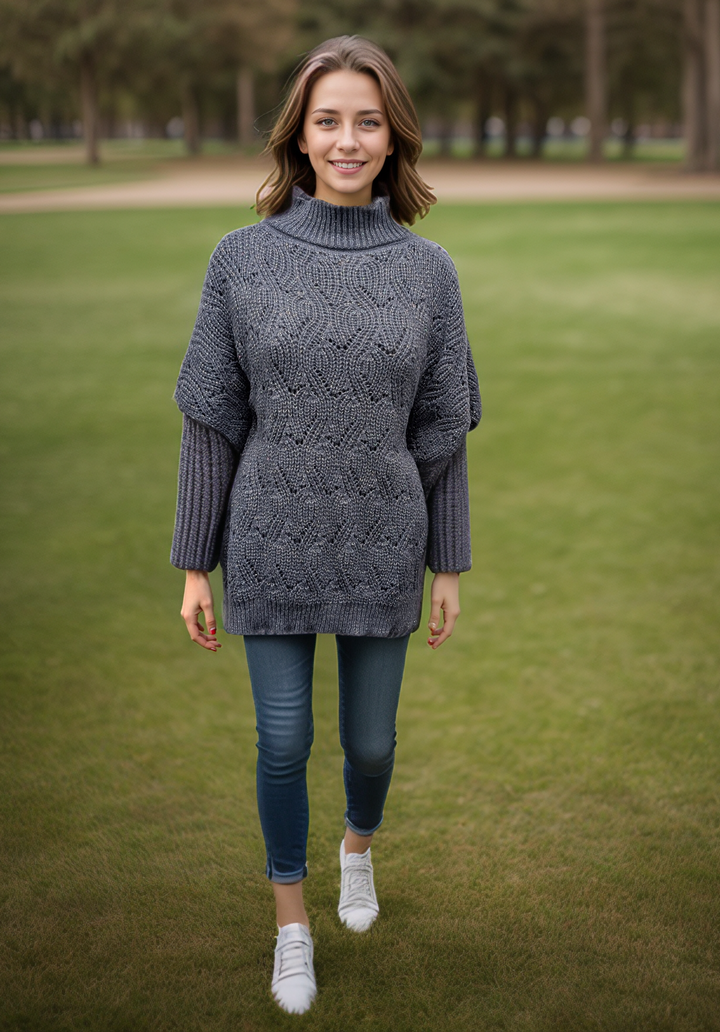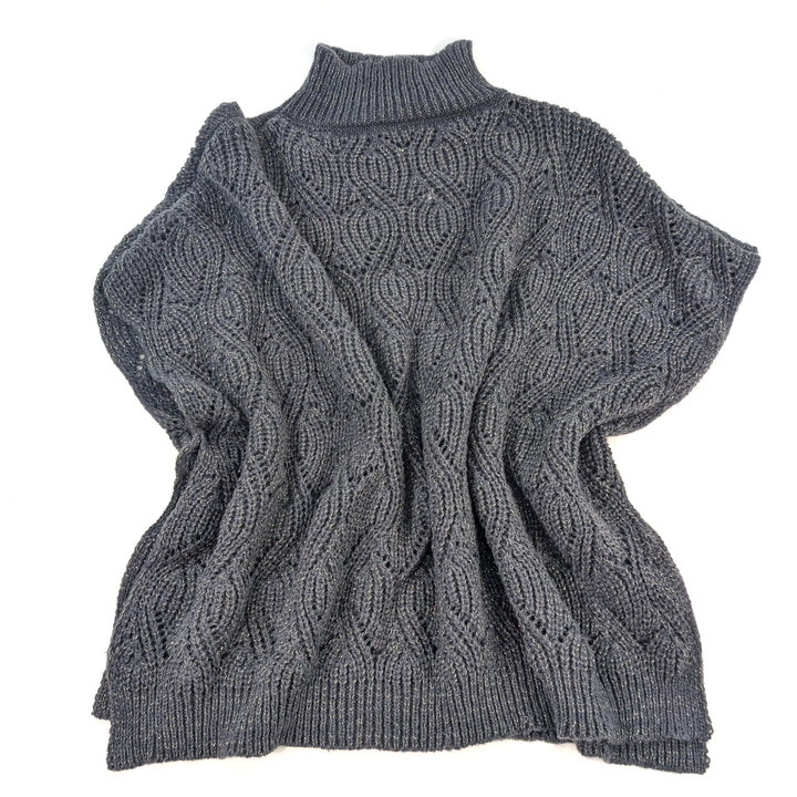 This sparkly grey high-neck poncho adds warmth and style in one easy piece. Its cable-knit pattern and light shimmer make it a winter wardrobe winnercomfy, flattering, and super easy to wear.