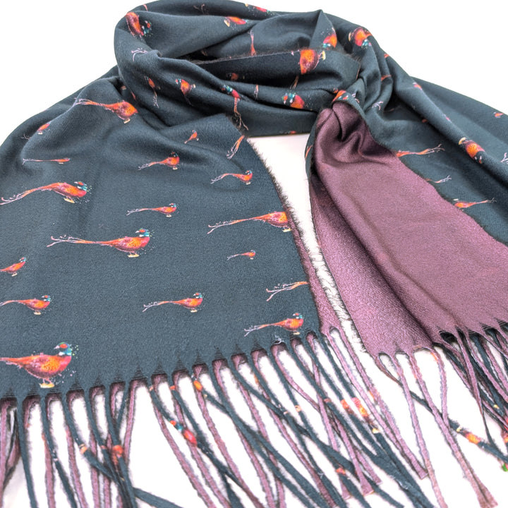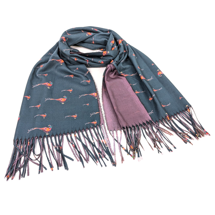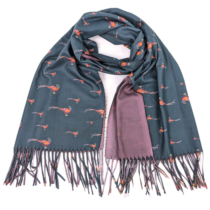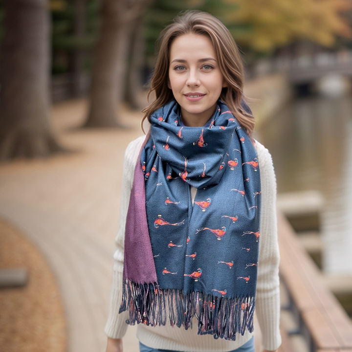 The Regal Pheasant Pashmina Style Scarf brings together British countryside influence and seasonal luxury. Its plum-toned reverse complements the vivid print while offering styling versatility. Cosy, elegant and giftable this scarf is made for country walks, chilly mornings, and winter style.
