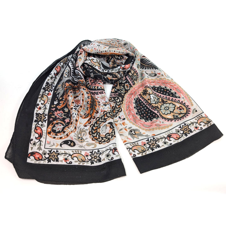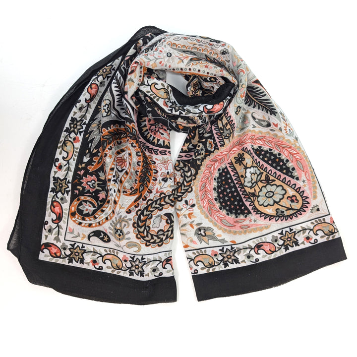 This black paisley scarf blends tradition and glamour. With golden details woven into ornate patterns, it's perfect for elevating both casual and evening wear.