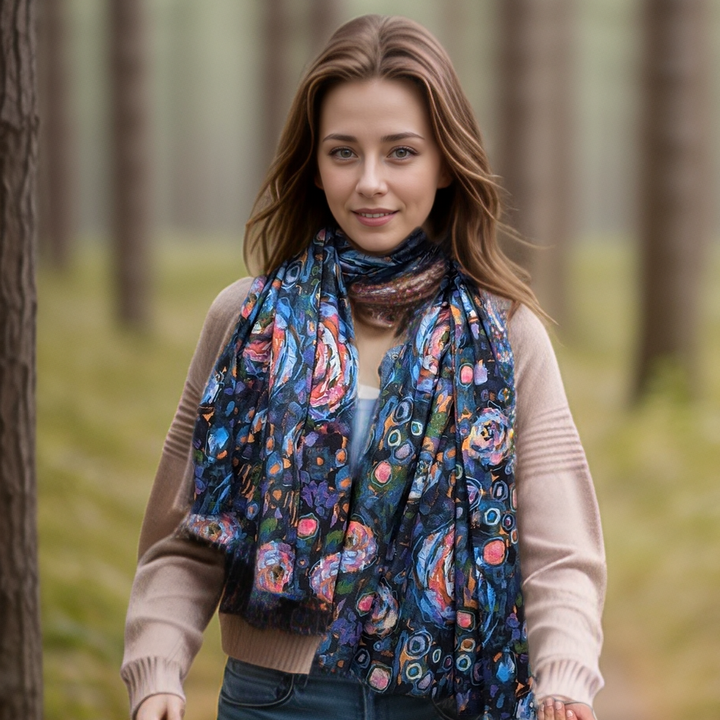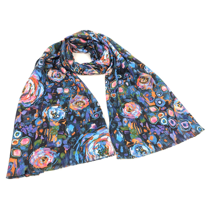 With a look inspired by abstract painting, this scarf makes a vibrant statement. The blue version brings out rich jewel tones that instantly elevate jeans, jackets or dresses.