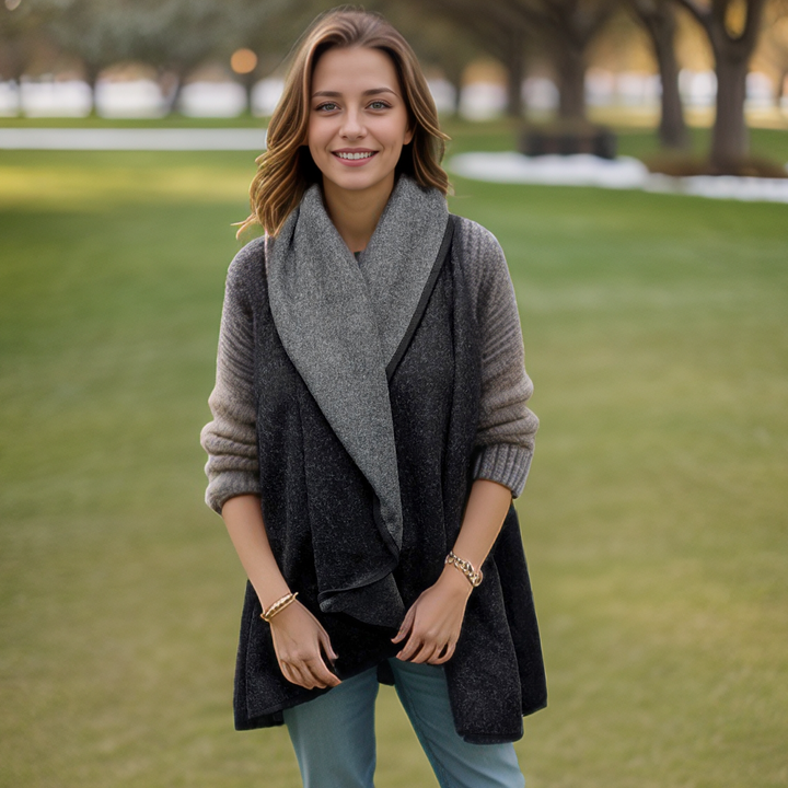 Blend classic grey tones with bold black for a versatile look that works from autumn into winter. Our Black/Grey Sleeveless Jacket adds depth, movement, and effortless style to any outfit.
