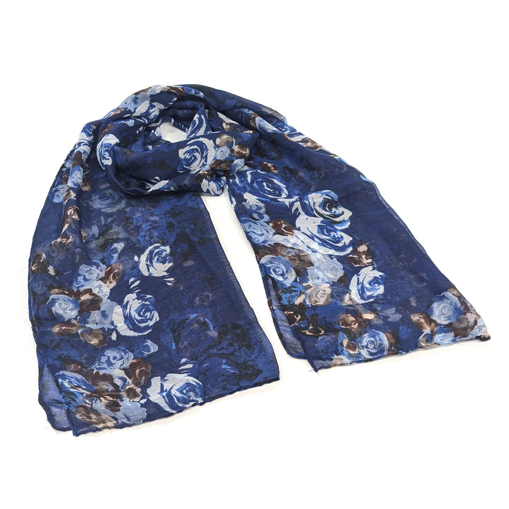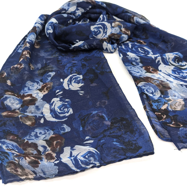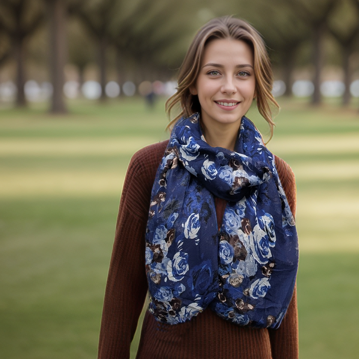 Add a cool-toned floral flair to your wardrobe with this elegant rose scarf. The design pops against denim, black, or neutrals perfect for autumn and beyond.