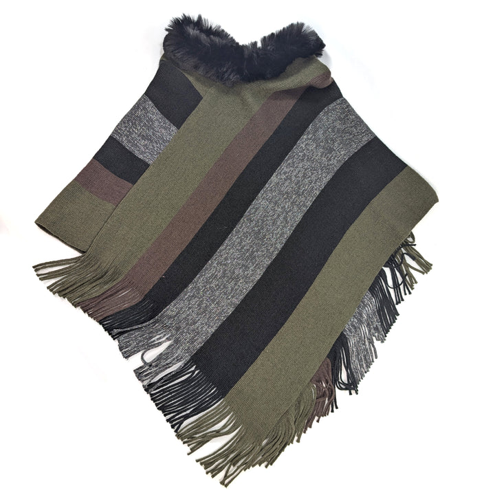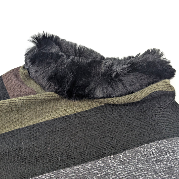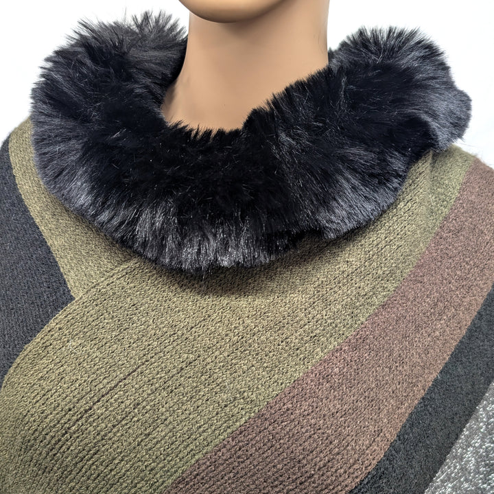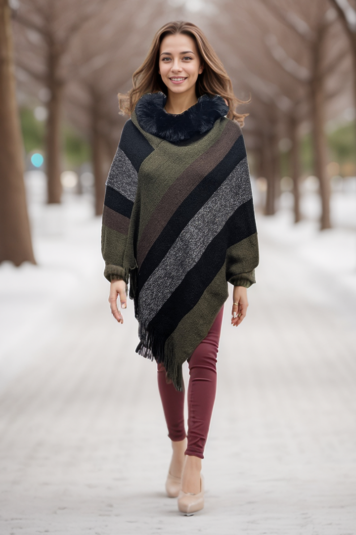 Embrace cold-weather layering with this striking poncho in shimmering tones of green, black, and grey. The faux fur collar brings both texture and warmth, making it a seasonal staple that combines fashion and function in perfect harmony.